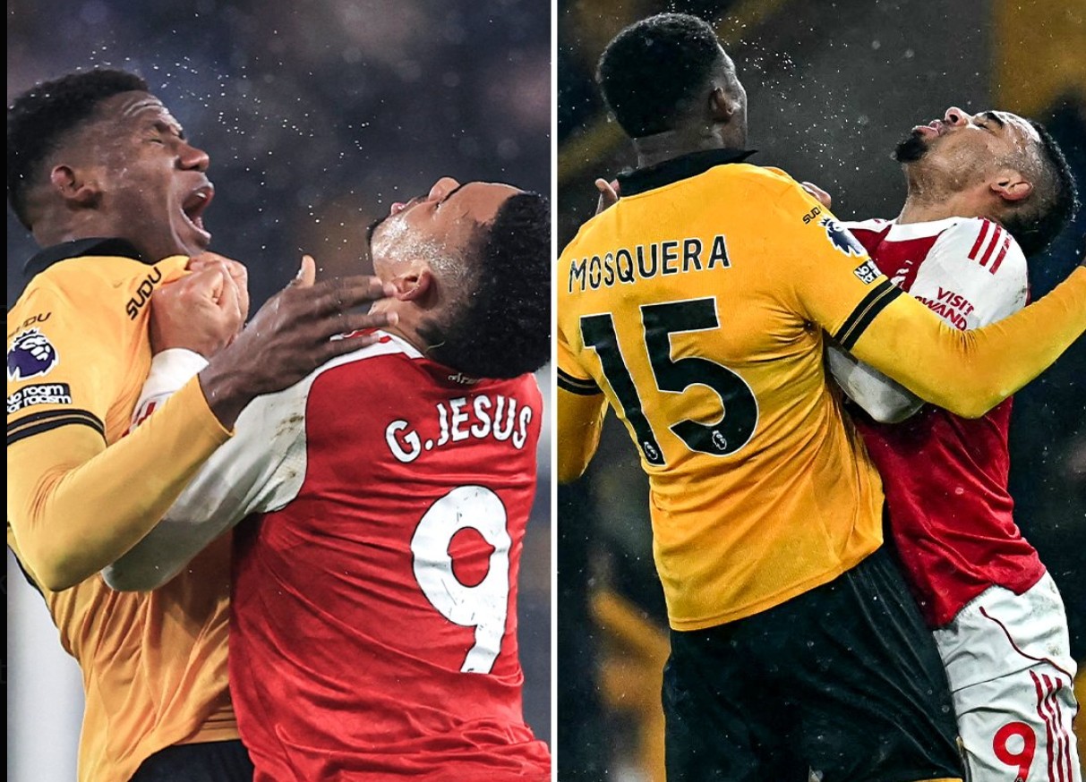 在这场跌宕悠扬的英超平局赛后狼队与阿森纳的球员爆发了防碍,热苏斯本来倒地不起,听到终场哨响后跳起来和敌手爆发肢体防碍。