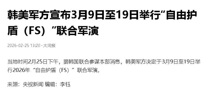 2、2026-02-25 大河报 韩好意思军方宣布3月9日至19日举行“解放护盾(FS)”集结军演