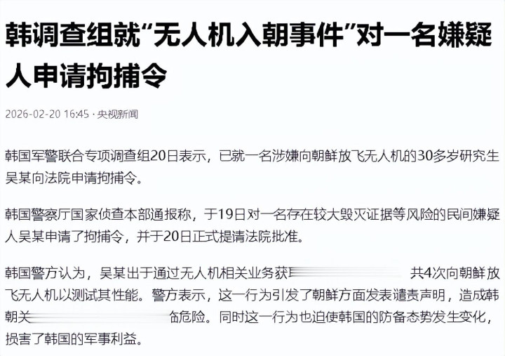 3、2026-02-20 央视新闻 韩造访组就“无东谈主机入朝事件”对又名嫌疑东谈主苦求拘捕令