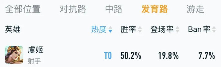 虞姬再次晋升为T0弓手,登场率濒临20%,胜率有50.2%