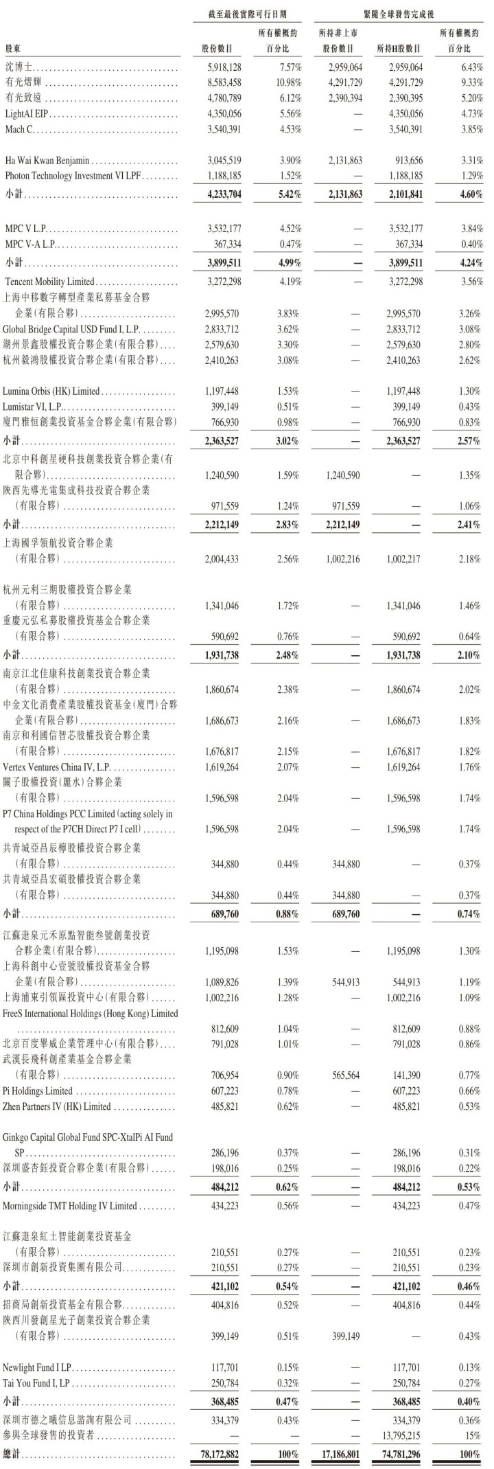 Ha Wai Kwan Benjamin持股为3.31%,Photon Technology Investment VI LPF持股为1.29%,一共持股为4.6%;MPC V L.P持股为3.84%,MPC V-A L.P持股为0.4%,一共持股为4.24%;