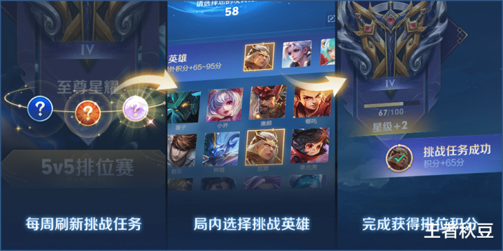 为了荧惑公共排位不练豪杰,多使用高熟悉度豪杰。官方每周会刷新三个挑战任务,推选三个豪杰,完成挑战,就能赢得排位的特等积分,加快上分。三个任务简略单慢慢贫窭,每周重置,难度越高,挑战得胜后的积分加成越多。