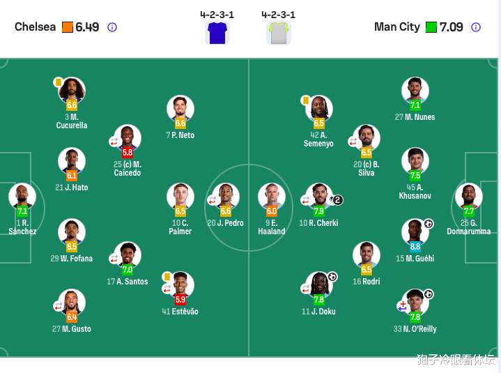 切尔西首发:1-桑切斯、3-库库雷利亚、21-哈托、27-古斯托(88’34-乔什·阿昌庞)、29-福法纳、17-桑托斯(67’45-拉维亚)、25-凯塞多(81’14-埃苏戈)、7-内托、10-帕尔默、41-埃斯特旺(67’49-加纳乔)、20-若昂·佩德罗(81’9-德拉普)。