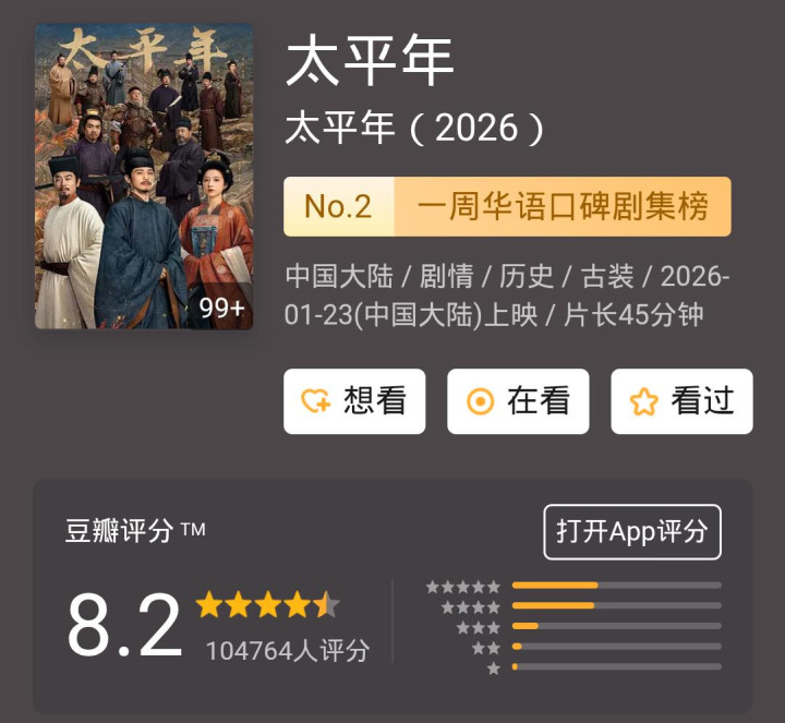 还有白宇、周雨彤、朱亚文、俞灏明、董勇、倪大红携手主演的古装历史剧《太平年》,虽说魔改历史凭空剧情,但是因为初度将五代十国搬上荧屏,外加制作邃密和大部分演员演技高出,最终相似是斩获了颇高的收视,豆瓣亦给出了8.2的高分,可见许多不雅众照旧挺招供的。
