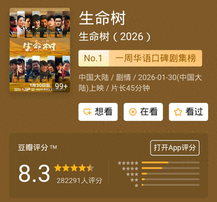 春节前,杨紫、胡歌、李光洁、张哲华领衔主演的现实方针题材电视剧《生命树》,收视与口碑达成双丰充,最终豆瓣评分锁定8.3,足见其举座质料不俗。