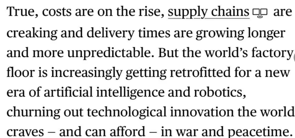报谈说,现时大家运载本钱不停高涨,供应链不胜重任,交货周期越来越长且难以洽商。但中国坐褥体系正不停进行校正,以允洽东谈主工智能和机器东谈主时间的新期间,并一语气不停地坐褥出全宇宙齐需要且背负得起的立异产物。
